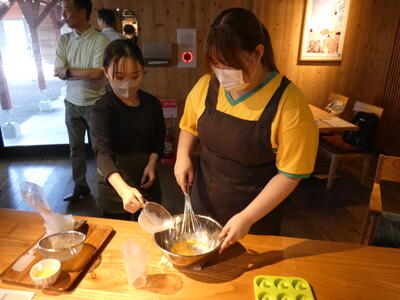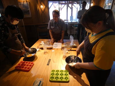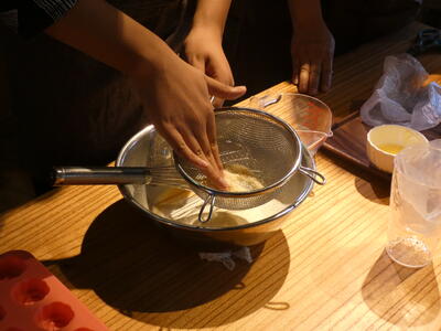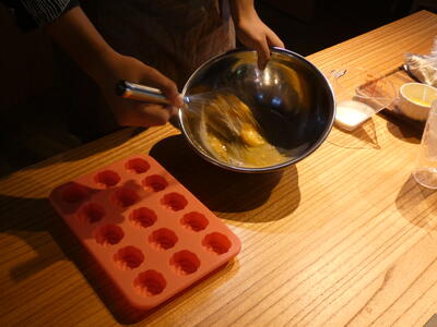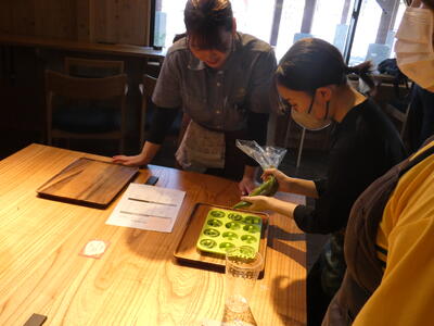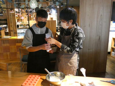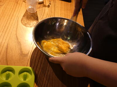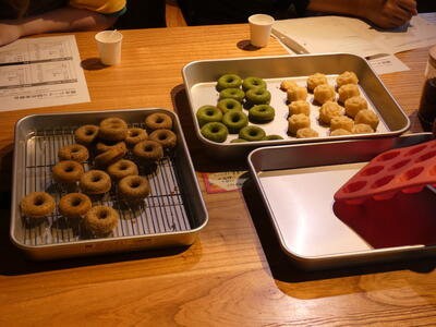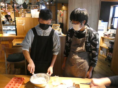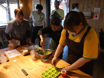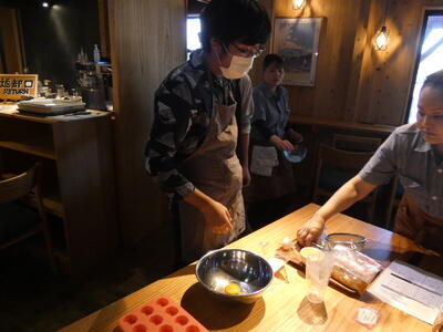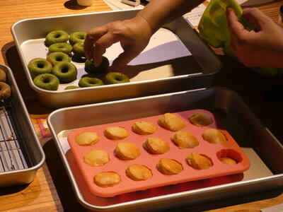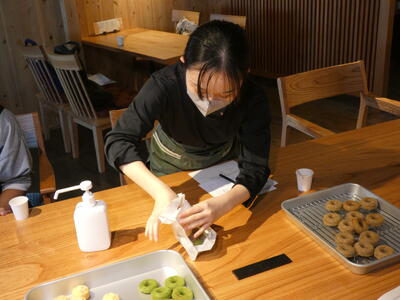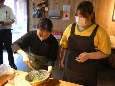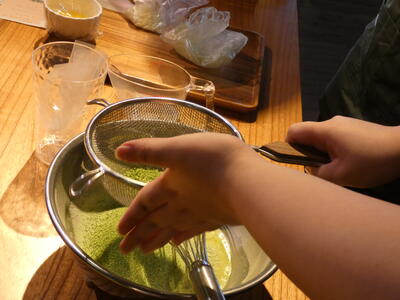 生徒の提案に合わせて、抹茶ドーナツの素材をこしらえてくださっていました。ひたすら混ぜます。