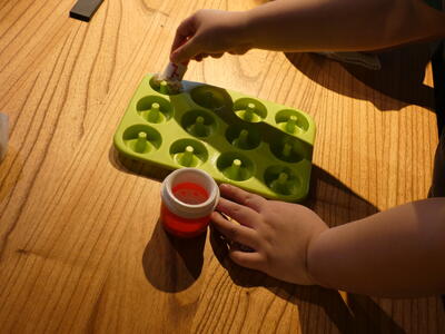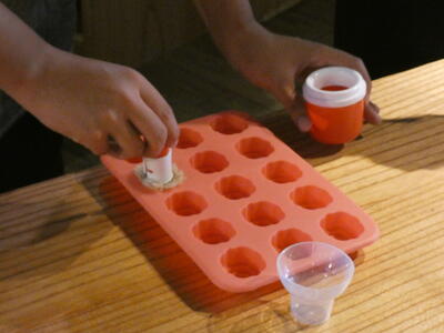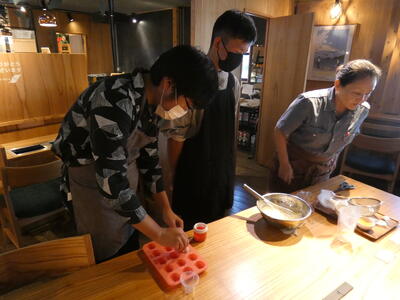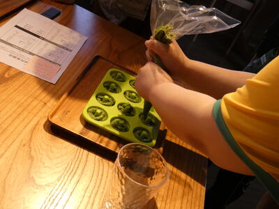 抹茶及び不知火の2つの液状化した合成食材を型に流し込むため、型に十分油を塗って滑らかにします。