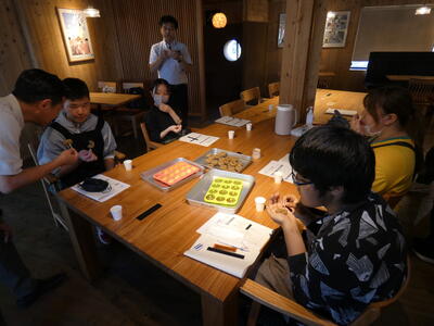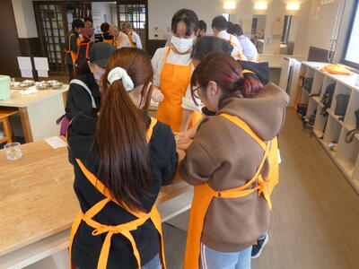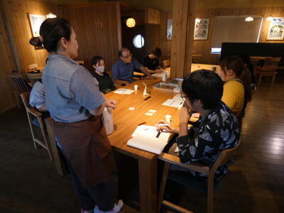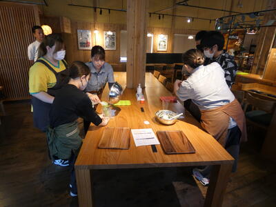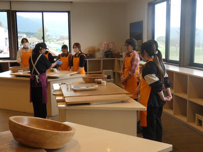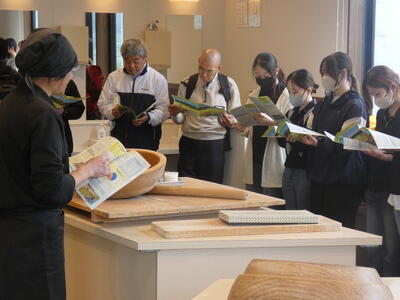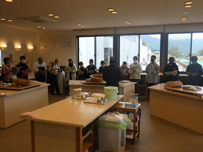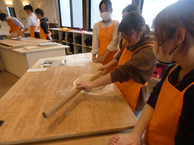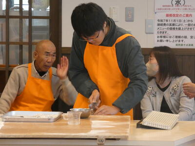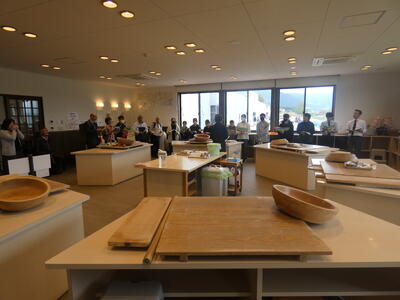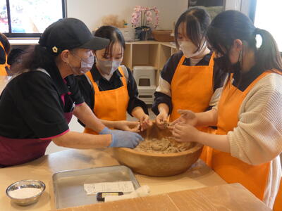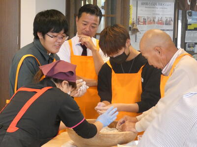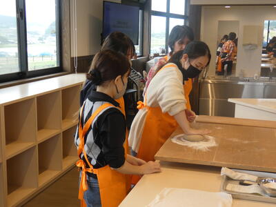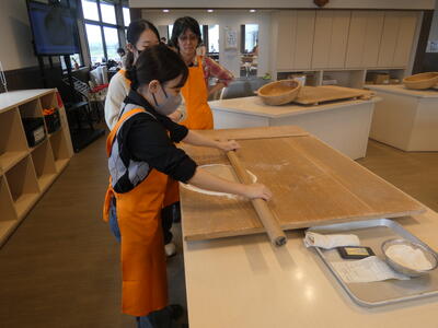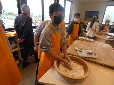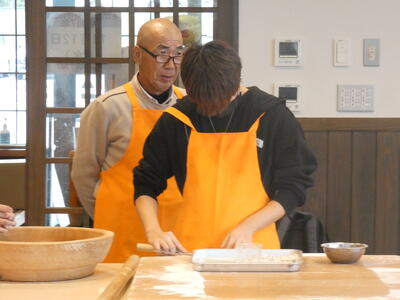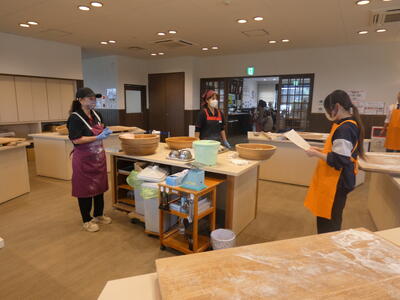 やがて定刻になり、そば道場様の施設へ移動します。そば道場では、講師の先生のご指導のもと、そば打ち体験にチャレンジしました。