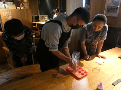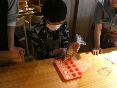 シェフの方々より優しく教わりながら、ボールから絞り袋に移し替えます。