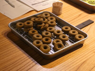 話し合いの結果、商品名はシンプルに「ミニ焼きドーナツ」と命名、売価は350円に設定しました。