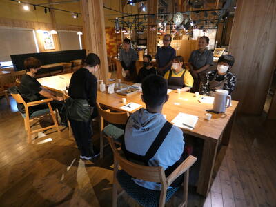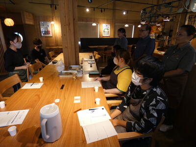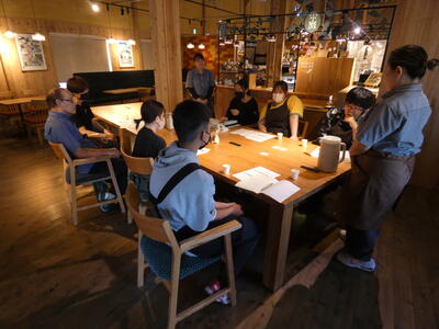 前回の検討会からおよそ二か月。この間にも、道の駅みなまたの館長様及びシェフの皆様は、通常の営業がある中、時間を捻出してこのコラボ企画のための研究及び下準備をしてこられていたのです。まずは、そのプロ段階での試作過程における所感からお話をしていただきます。生徒は、真剣にメモをとっています。