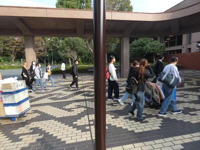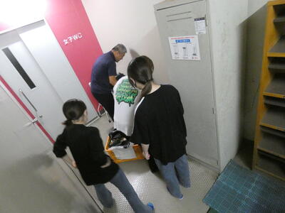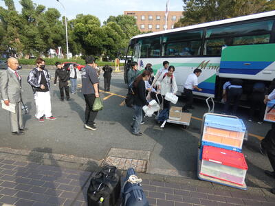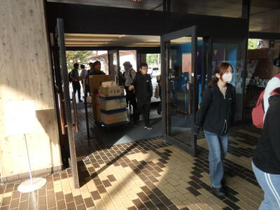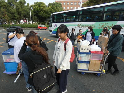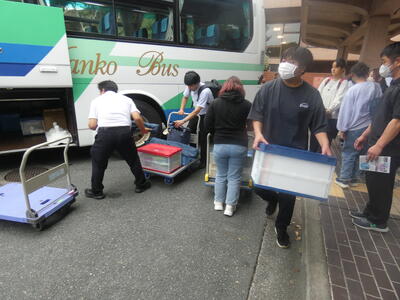 県立劇場に到着したら、作品展示と販売実習のための荷物を降ろします。