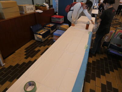 まずは、土台となる白いシートを敷いていきます。テーブルとテーブルの間に折り目を曲げ、丁寧にメイキングをしていきます。「のぼり」は本校の屋号が入った貴重なPRアイテムですので、確実に棒に通しながら広げていきます。