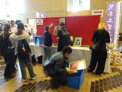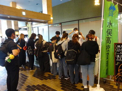 左右からのショットです。青い箱は、本校の創作班「光班」が誇る幻想的な作品です。テーブルの手前には、水俣高校定時制のホームページにリンクするQRコードが入ったネームプレートを置きました。本校定時制のことを少しでも多くの人に知ってもらうための工夫です。