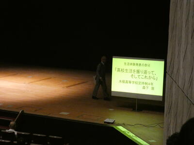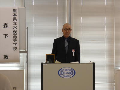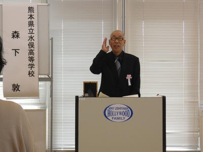 身振り手振りを入れて発表する姿は、この発表に思いを込めていることを感じました。なぜ高校に行こうと思ったのか。その答えに悩み、迷った経験がある人も多いのではないでしょうか。長い年月を経て高校生活を始めるなかで、目的や意義を自覚しながら前向きに歩んできて、周囲の励ましや仲間との関わりを通して水俣高校の生徒である誇りと自信を深めました。また、検定試験に向けての強い意志と努力の姿勢は、クラスメイトはもちろん、今日ここにいる私たちにも大きな勇気を与えてくれました。卒業後も地域や人々に喜びを届ける活動を続け、ますますの活躍を心より願わずにはいられない、そんな内容でした。
