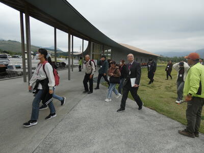 まずは横断幕を持って記念撮影、その後館内へ移動します。