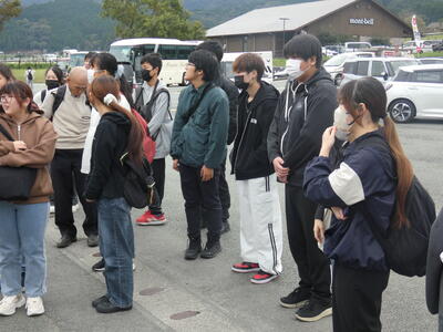 待ちに待った校外学習です。前日まで心配されていた空模様でしたが、何とか持ちこたえてくれ、生徒諸君は元気いっぱいです。