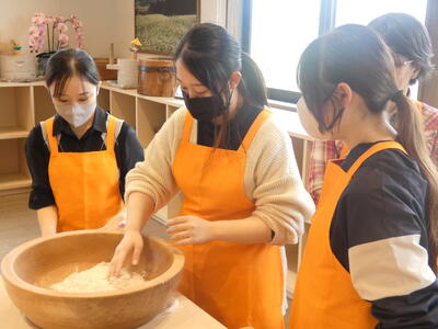 そしていよいよ体験です。みんなで協力して小麦粉と水を混ぜます。