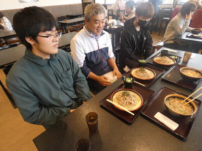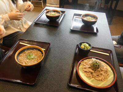 出来上がりです。自分たちで打ったそば麺を茹でてもらいました。好みに合わせて、かけそば・ざるそばをそれぞれ作ってもらいました。