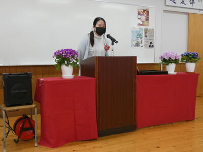 続いて、1年在校生の生徒会長から惜別の挨拶がありました。先輩や同級生たちが頑張っている姿を見ながら自分も頑張れたことや、行事での楽しい思い出が語られ、寂しさの中でもや先輩たちの卒業後の活躍を祈念する旨の立派な送別の言葉でした。
