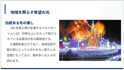 まず、「日本近代化の光と、公害の教訓」として、チッソ株式会社(現JNC株式会社水俣工場)の歴史を紹介しました。現在は地域社会への感謝と希望を込めて、毎年イルミネーションが開催され、水俣の冬を彩る風物詩となっています。