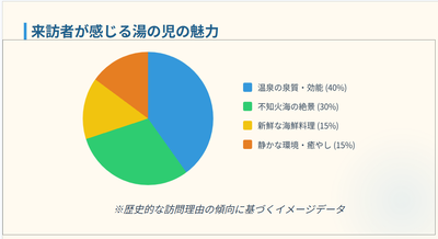 次に、景行天皇の時代に、傷ついたウミガメが浅瀬で傷を癒しているところから発見されたという伝説が残る湯の児温泉について紹介しました。来訪者の感じる湯の子温泉の魅力がグラフ化され、分析されていました。