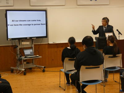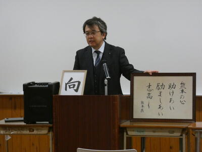引き続き、終業式です。校長講話では、行事が目白押しであった1年間の総括をして、定時制の生徒たちのがんばりを労ってくださいました。校長先生は、始業式や終業式といった式典での式辞において、生徒への思いを込めた漢字一文字を額に入れて紹介してくださいます。今回は、熊本県の教育目標である「熊本の心 ~助け合い、励まし合い、志高く~」を実現させる一字として「向」という漢字を示してくださいました。これは、夢の実現に「向」かって努力することの大切さを表す漢字です。そして、ディズニーの創始者であるウォルト・ディズニーの『私たちの夢はすべて叶う。夢を持ち続ける勇気さえあれば』を、今年度の結びと同時に、来年度の新たな挑戦に「向」けたスタートの言葉として贈ってくださいました。