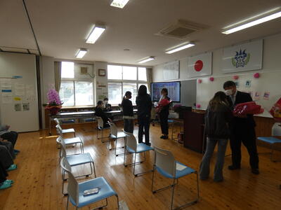 登校後は、教室に集合して最後の動作確認及びコサージュ装着を協力して行います。事実上、最後の教室でのひと時となります。
