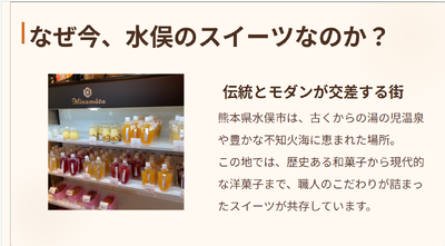 まずは「水俣スイーツ巡り」と銘打って、水俣を歴史ある和菓子から現代的洋菓子まで多様なスイーツが共存する町として紹介しました。かつて工業が盛んだった時代に労働者の疲れをいやすものとして甘い物が重宝されたという歴史的背景も併せて説明してくれました。