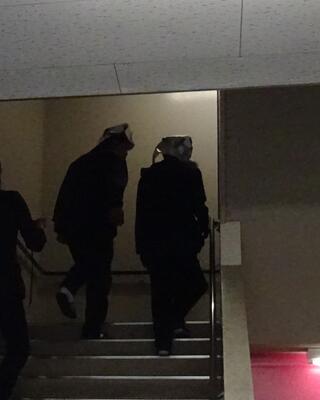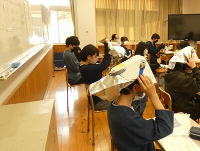 揺れが収まったころあいで、避難指示の放送に従って避難開始です。防災頭巾を使用するのは生徒・職員ともに初めての人が多かったですが、慌てず円滑に装着することができました。