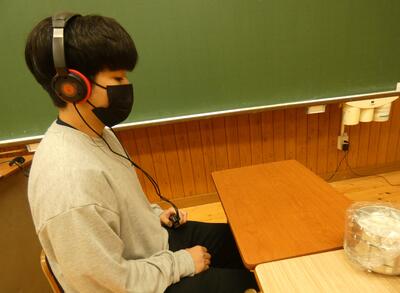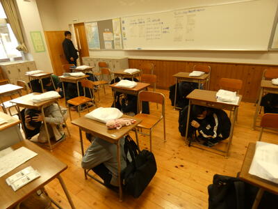 落下物に備え、防災頭巾の使用法についても確認しました。その後、訓練地震発生の放送が入り、机の下に身を隠します。