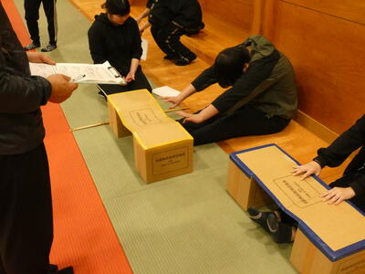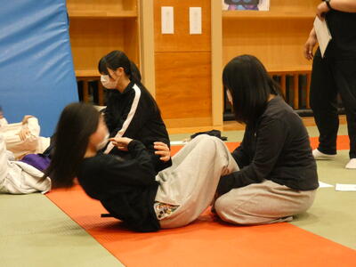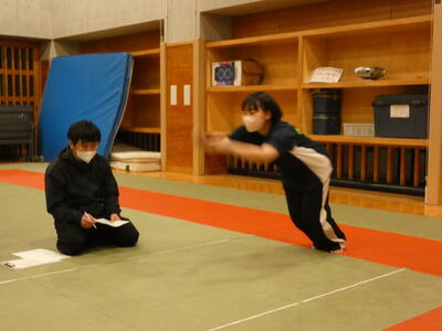 柔道場で実施した種目は、握力、立ち幅跳び、上体起こし、長座体前屈の4種です。協力して行います。