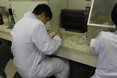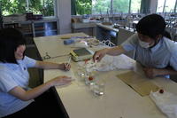 ぶどうの木の常在菌を確かめるため、寒天培地を作成しています。慣れない作業で戸惑いながらも実験の準備を進めています。