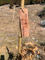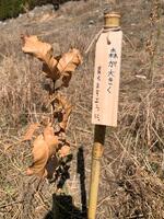 クヌギ苗は、竹の支柱に結び付け、プレートを結び付けていきます。今回の取り組みは、『緑の流域治水』の一環でもあり、防災減災の為の森づくりです。
