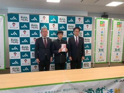 JA共済連熊本本部長の橋本様より目録が贈呈され、校長先生と生徒会長の愛甲さんが受け取りました。