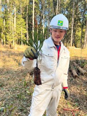 もともと、スギやヒノキの苗は根っこがむき出しの状態でした。これではせっかく植えても枯れてしまう可能性があります。最近は、写真のように根元に土がついた状態の苗を使います。これであれば、活着率が上がるのです。