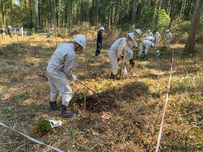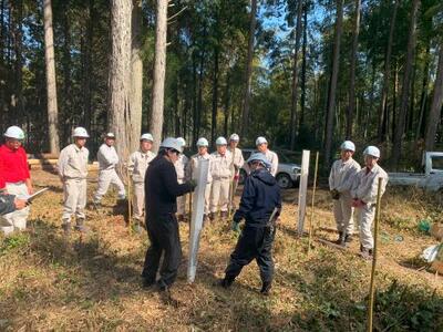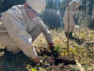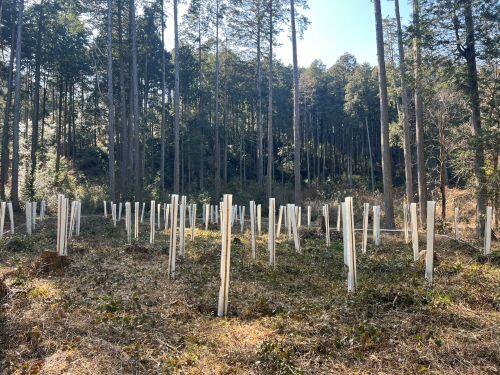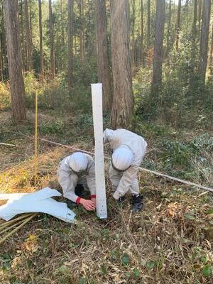 また今回は、ツリーシェルターも100本分いただき、設置しました。これは小さな苗をシカなどの食害から守るためのものです。これがあれば下刈りで誤って苗を切ってしまう心配もありません。