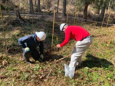 環境コースでは、クヌギのドングリを地域の幼稚園生と共にポット苗にし、その後、苗畑で育てています。2年過ぎて1mを越えてきた苗は、3月に山に植林します。今回は、すぐに移植できるように掘り起こしました。