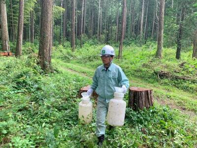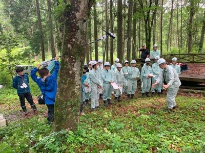 演習林の横に流れている小川付近の樹木を伐採し、4mほどの丸太にして川をせき止めていきます。いつも林業で伐採するような大きなスギ、ヒノキではないので、生徒達でも施工できます。