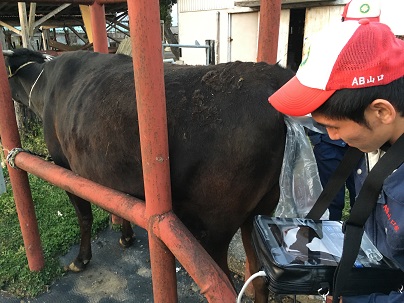 繁殖技術講習会の内容は「牛の直腸検査技術習得」。直腸検査は勿論、超音波画像診断装置を活用した技術についても教わる予定です。