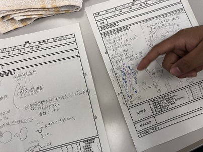 「これが卵巣だよ」「今、ひっくりかえした」二人しか分からない世界。直腸の中で子宮を触診しながら先生からアドバイスを頂くことが出来ました。始めて卵巣の触診ができた生徒もいました。感覚を忘れないうちに練習を積むことで確かな技術となります。とても貴重な経験をさせて頂きました。