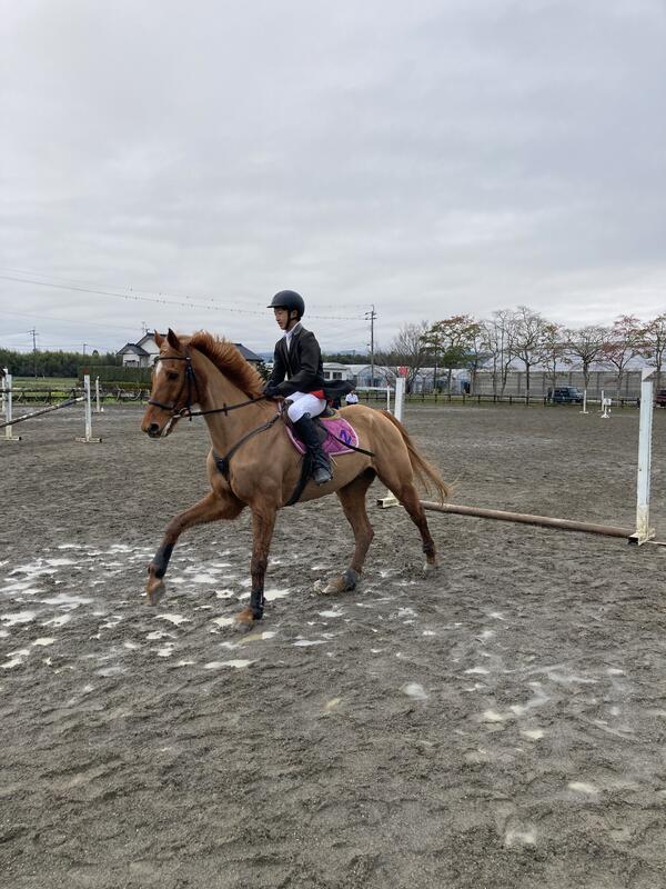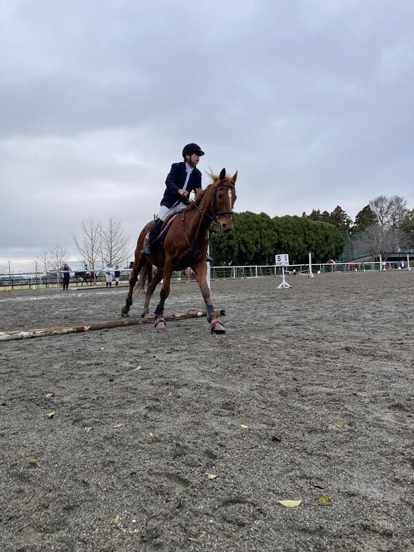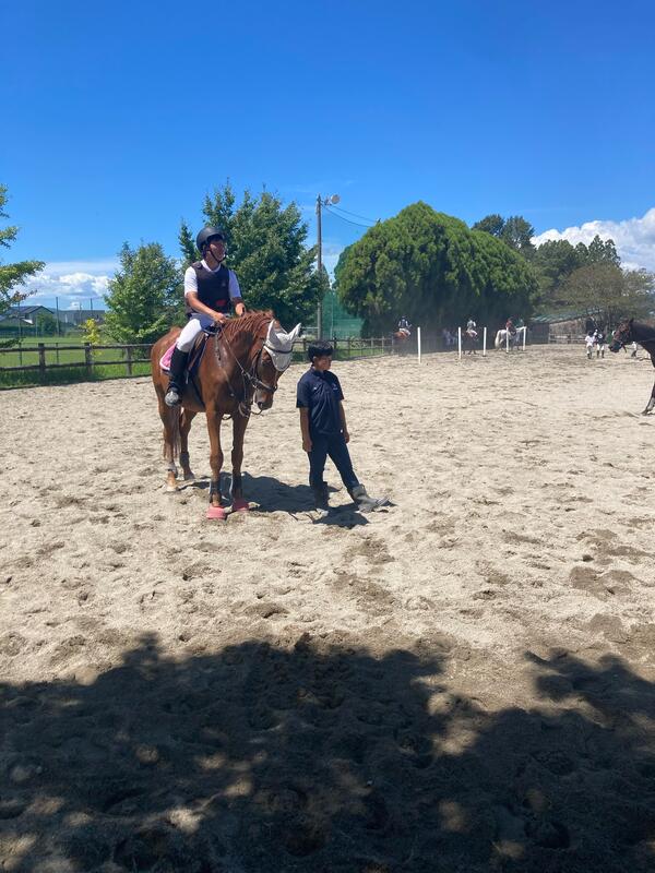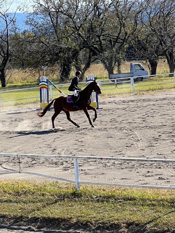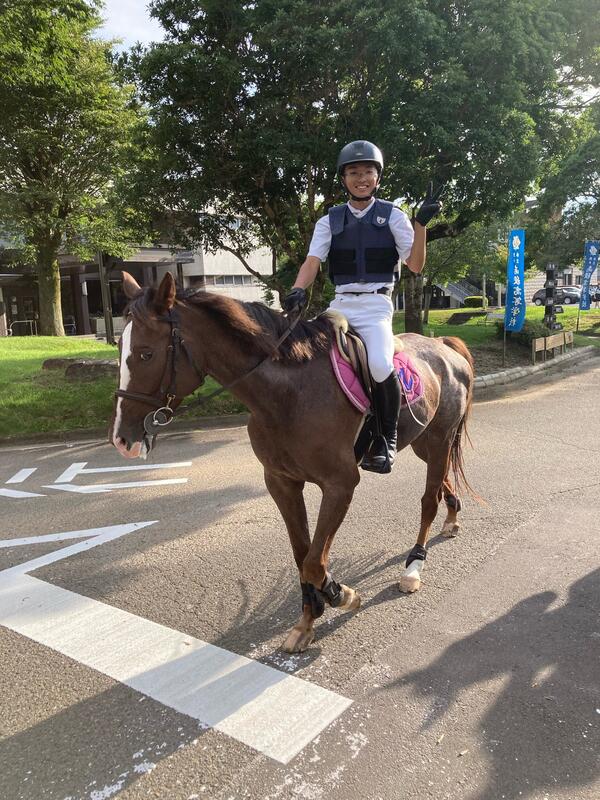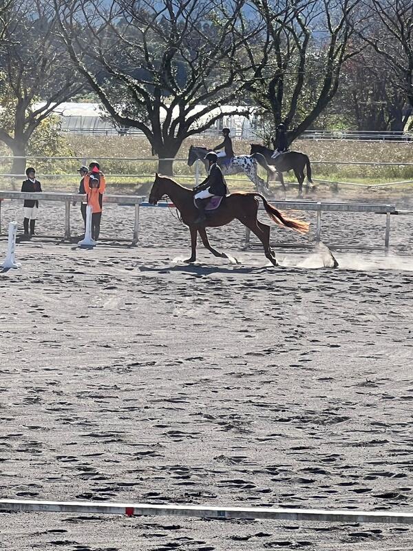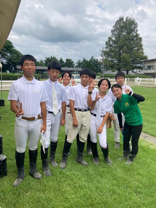 今回の全国大会では、たくさんのことを学べたり、自分の課題を見つけたりなど様々な経験をすることができました。初日に静岡に着いたとき、初めて会場を見て正直とても緊張しました。でも、大会に出てくる馬達の練習や走行を見て、軽く乗ったり、制御の仕方に工夫が必要だったりでどう乗れば乗りこなせるかなど考えているうちにその緊張がいつの間にか解けて、「あの馬乗ってみたい!」「あの乗り方今後に活かしたい!」などと、見ているだけでもたくさん学べてとても楽しむことができました。応援していただいた学校や保護者、地域の方々の皆さま、本当にありがとうございました。この経験を活かし、今後もっと技術を伸ばして来年はチームみんなで入賞したいと思います!!