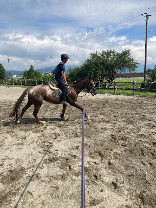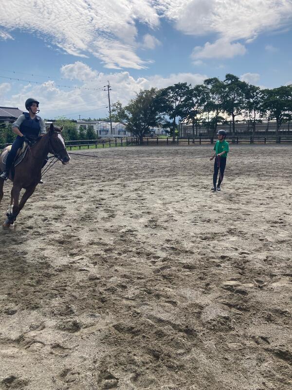 続いて1年生の騎乗練習を2年生部員が行っていました。2年生が調馬索ロープを用いて、馬のコントロールをしながら後輩が騎乗しています。