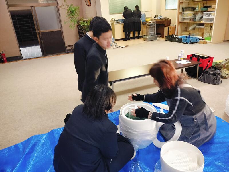 部員全員で1つの大きな作品を生けることに挑戦するため、まずは土台の花器作りから始めます急ぎ