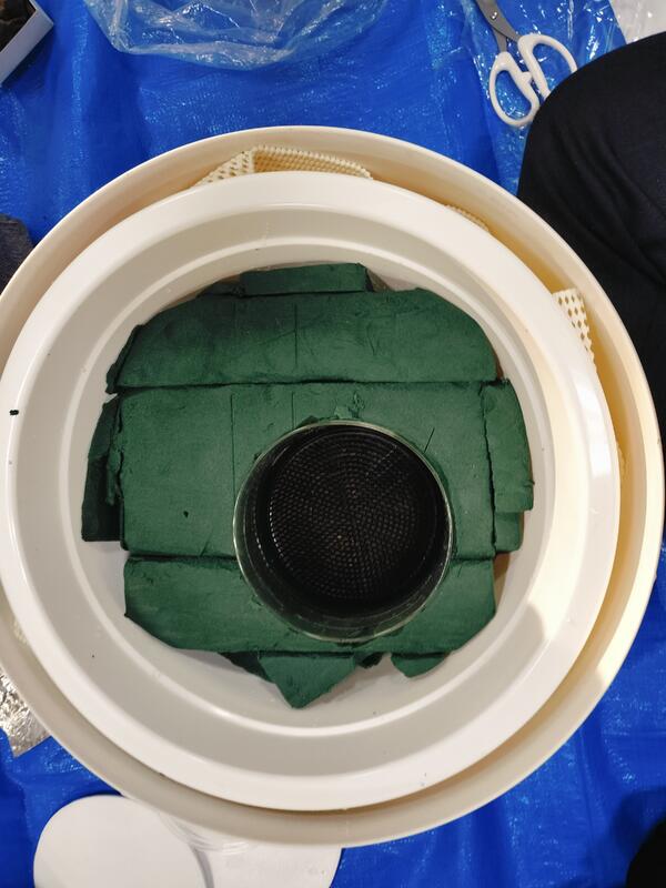 洗面器の中には、花を挿す土台となるオアシスというスポンジや剣山を入れていきます興奮・ヤッター!