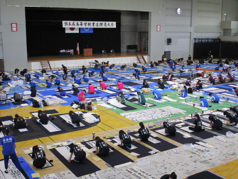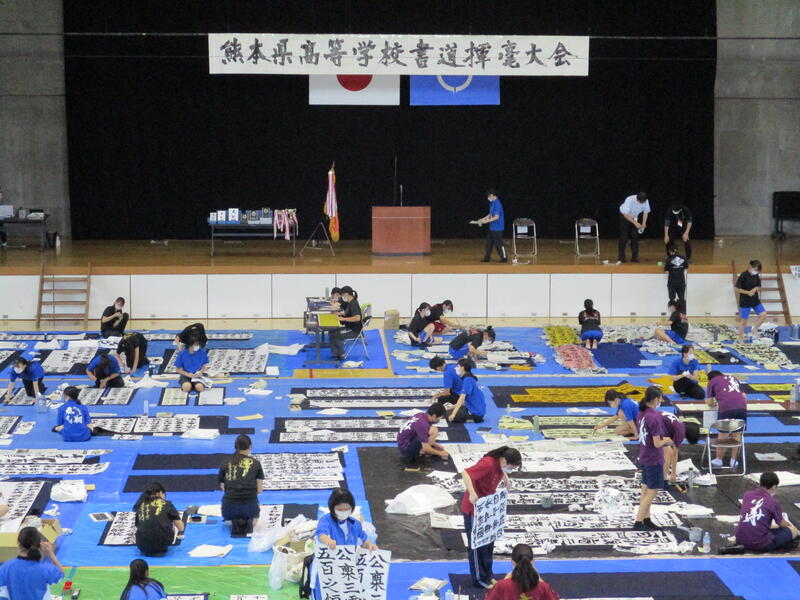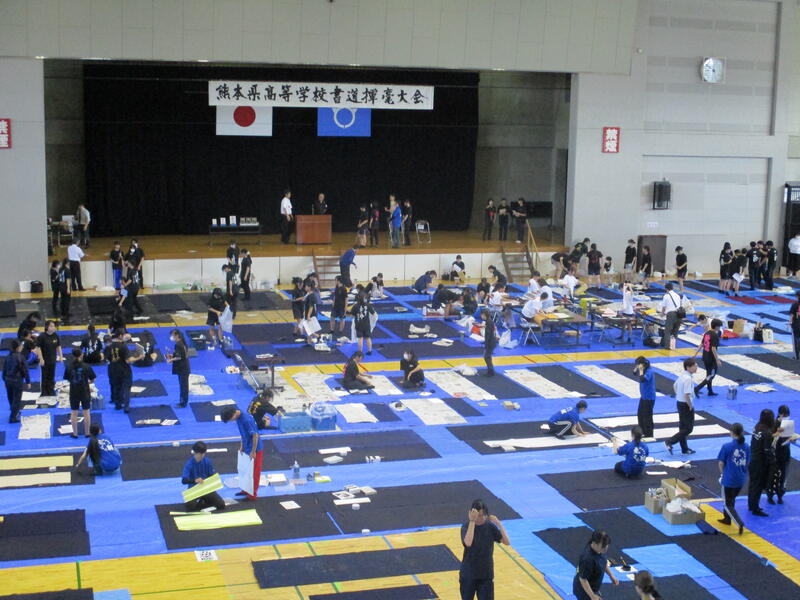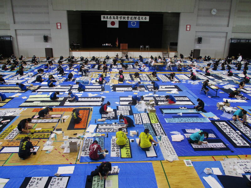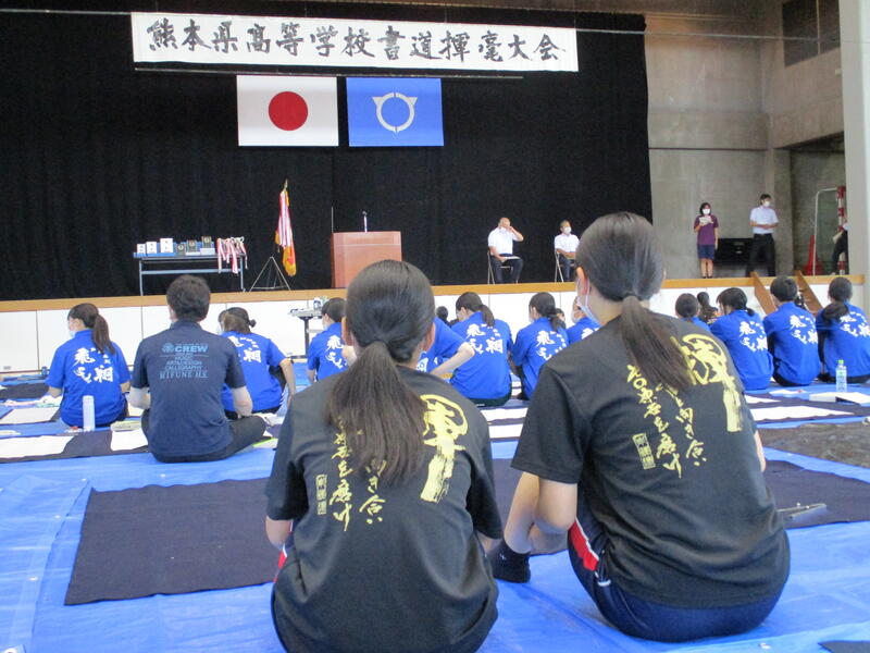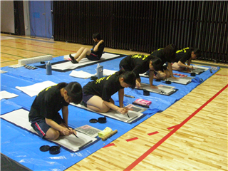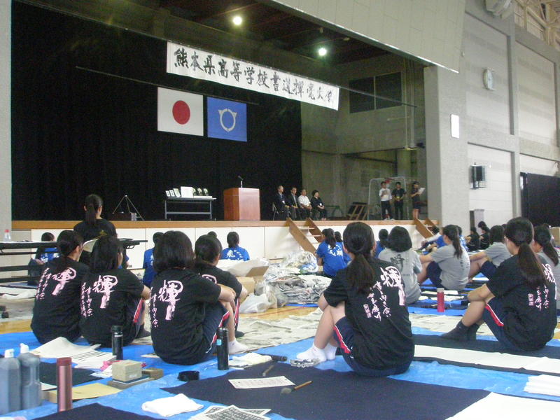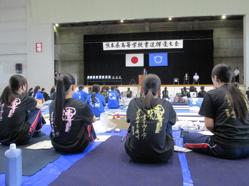 9月13日(土)に宇土市民体育館で開催された県書道揮毫大会に南稜高校書道部員4名が出場しました。当日は県下高校の書道部員250名近くが揃い、体育館の中はこの一年を通して磨き上げてきた日頃の練習の成果を十二分に発揮せんばかりにと熱気に満ちあふれていました。