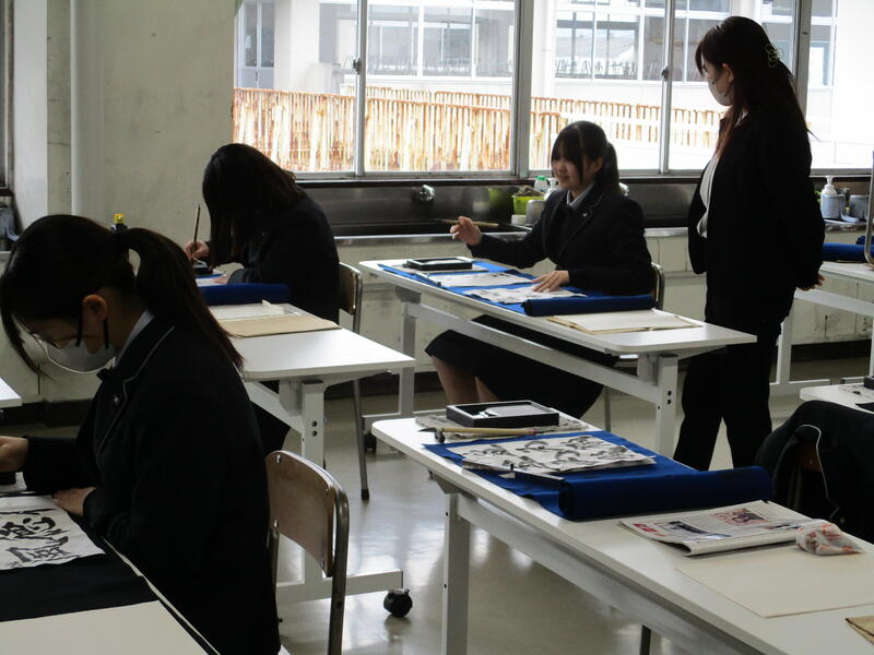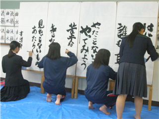 このように、日々協力し合いながら楽しく紙に向かって自分の気持ちを「書」に表わしています。現在部員の半数は初心者です。経験者でもそうでない人もお互いひとつになって頑張っています。興味のある方は是非書道室をのぞいてみてください。これからも南稜高校書道部をよろしくお願いします。