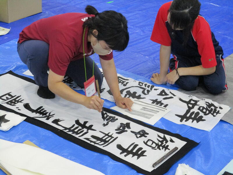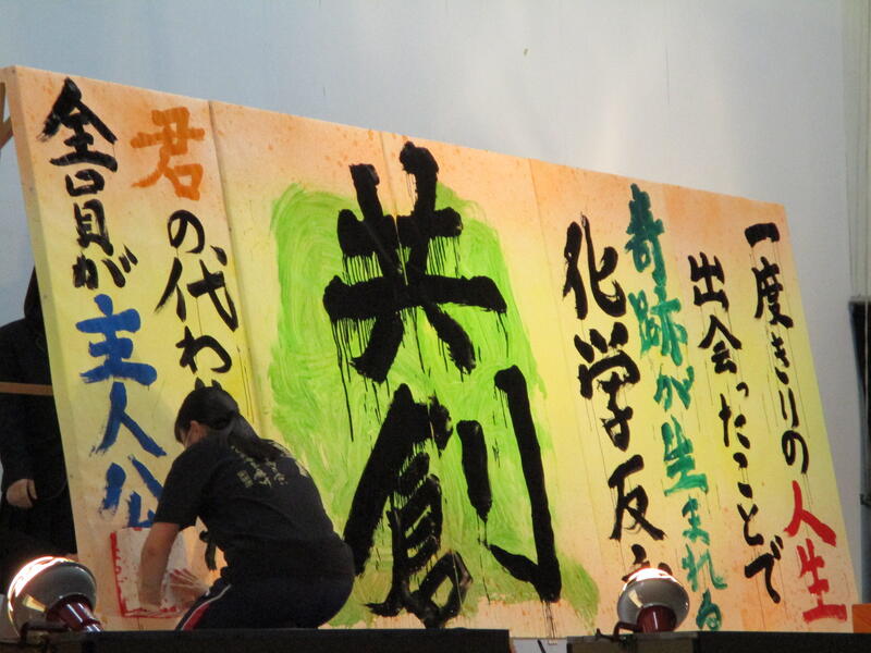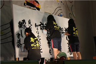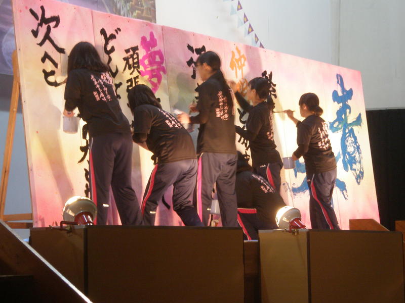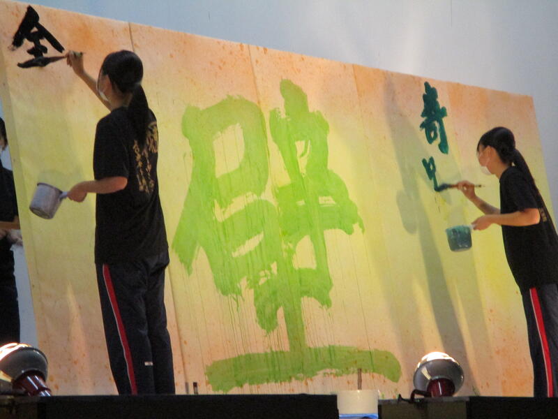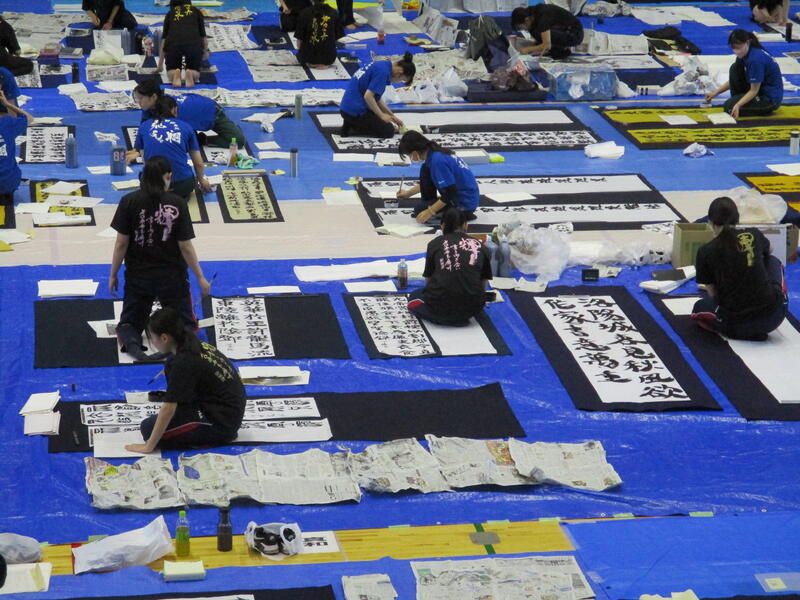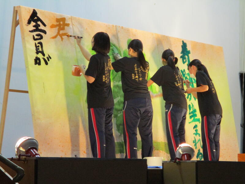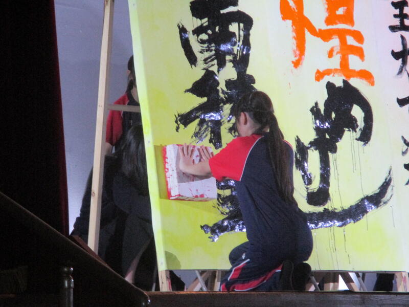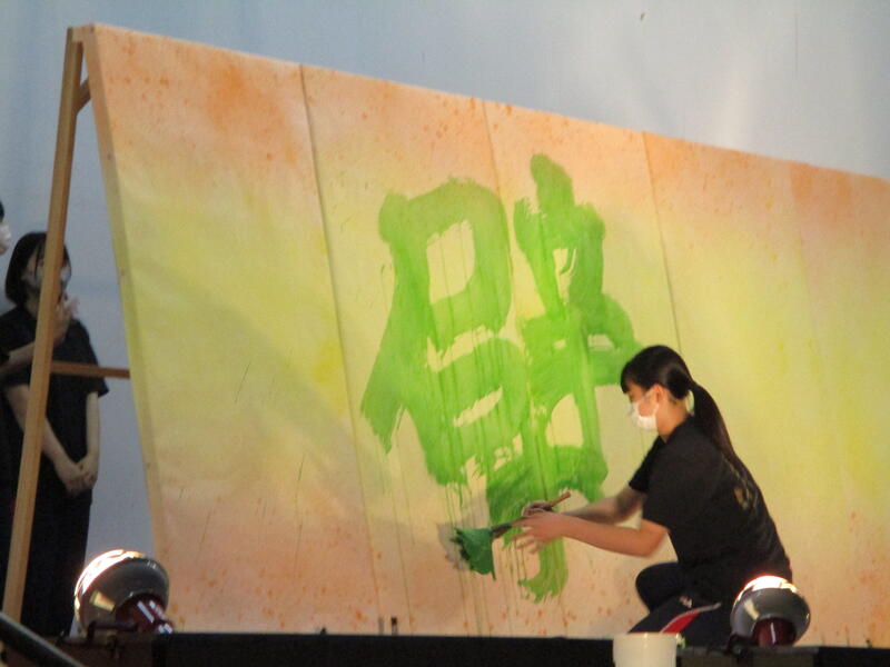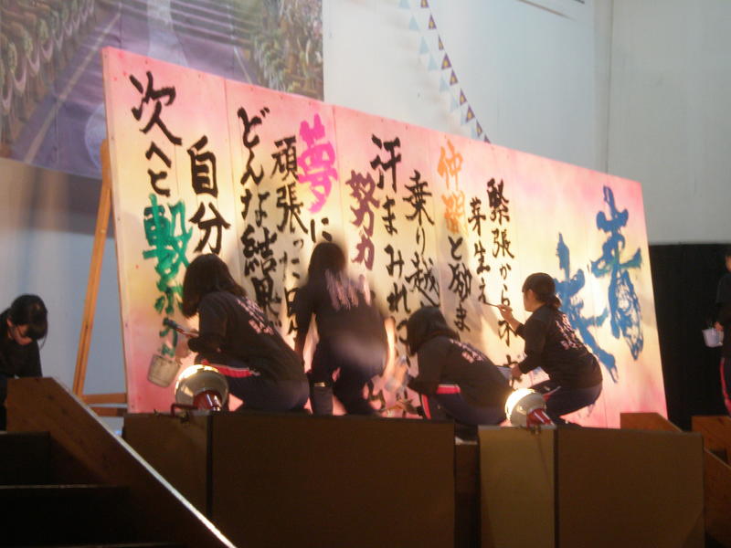 一心不乱に筆を動かして作品を完成させていました。体育館内からも大きな盛り上がりが見られ、