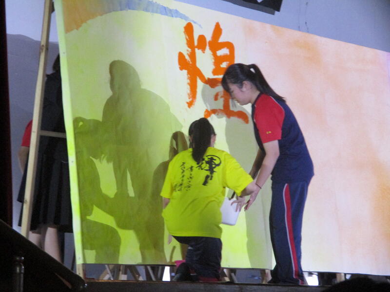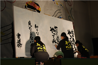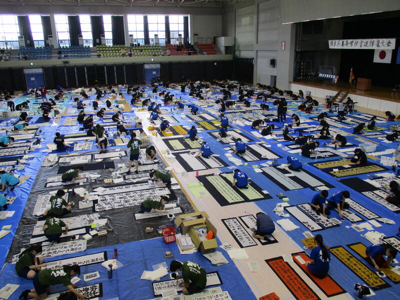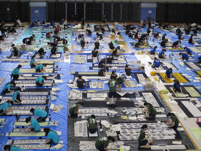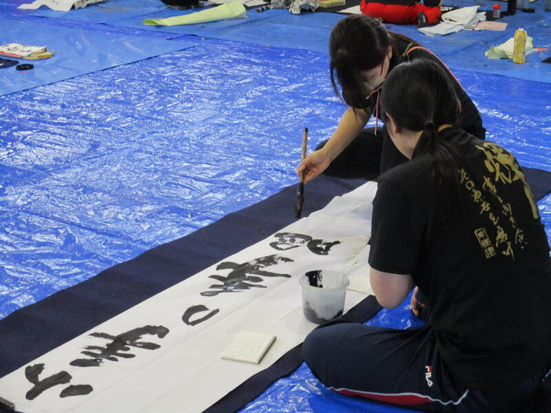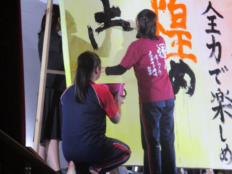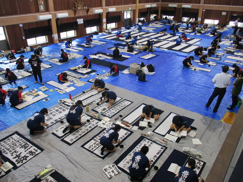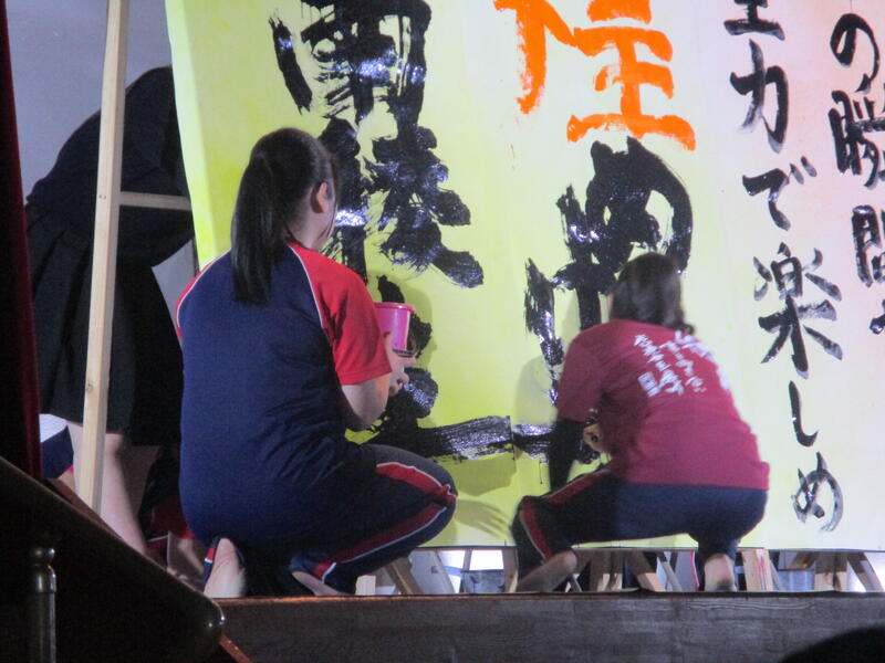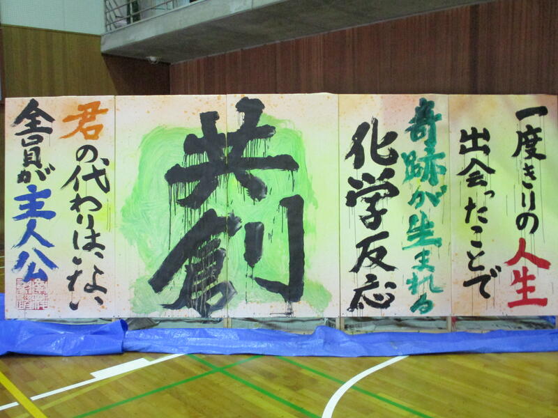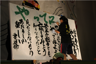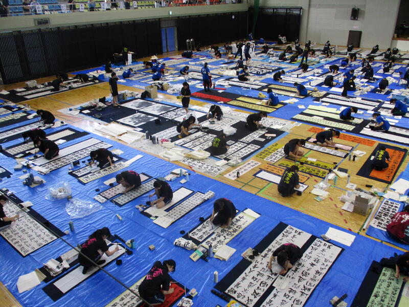 一心不乱に筆を動かして作品を完成させていました。体育館内からも大きな盛り上がりが見られ、