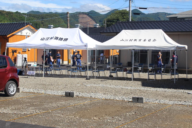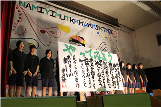 部員全員がバトンをつないで最終走者が書き終わったら、全員本部テント前に集合して書いた文字の御披露目です。