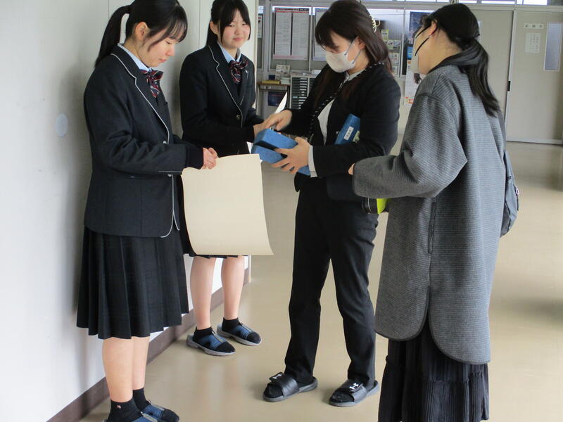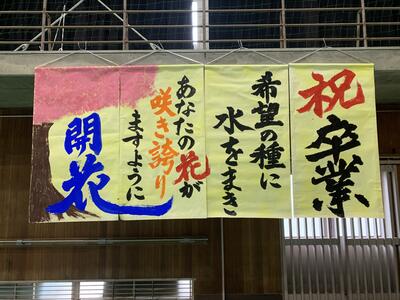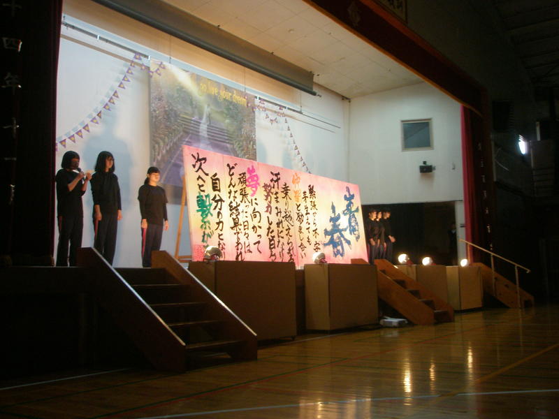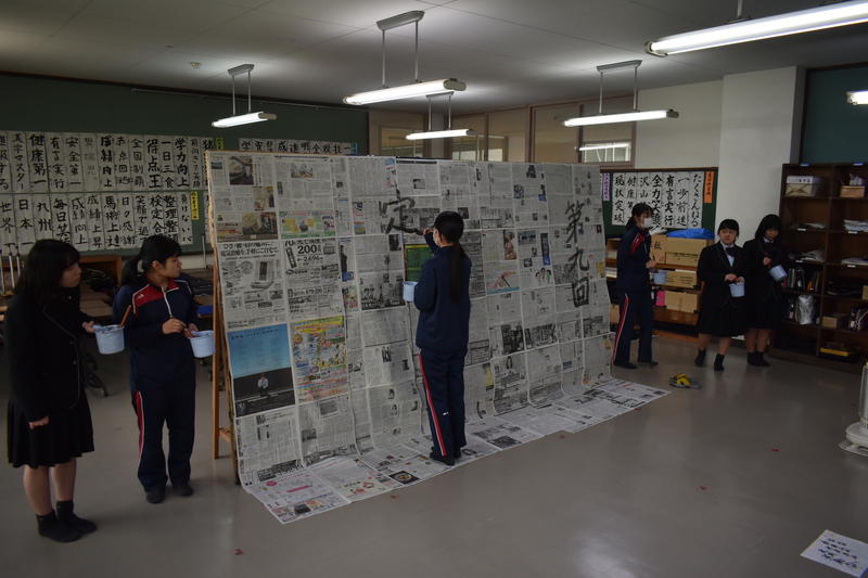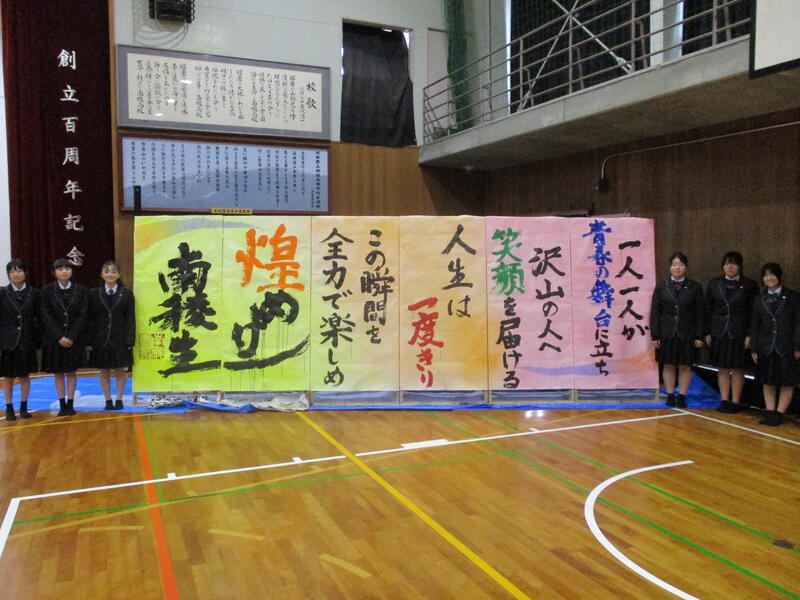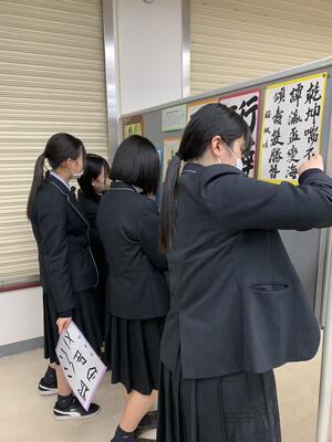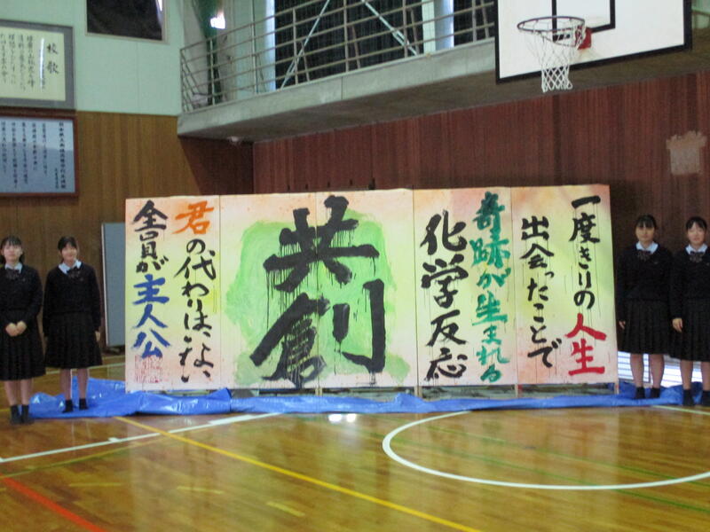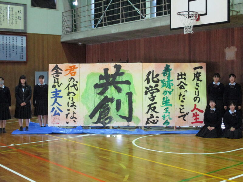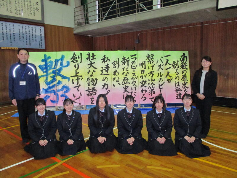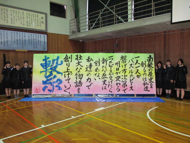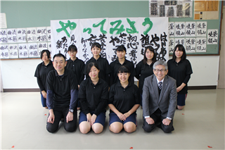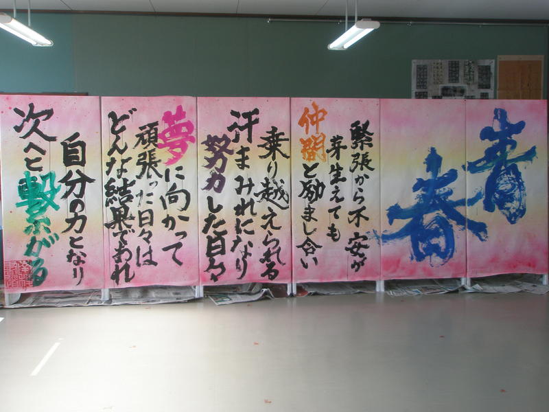 無事に発表が終了し、発表が成功するのか不安でしたが、発表終了直後の一同ホッとした様子が何とも印象的でした。書道部員5名が練習を重ねながら精一杯取り組んだ成果を十分に発揮してくれました。終了後は部員一同作品をバックに卒業アルバム用の写真を撮影しました。