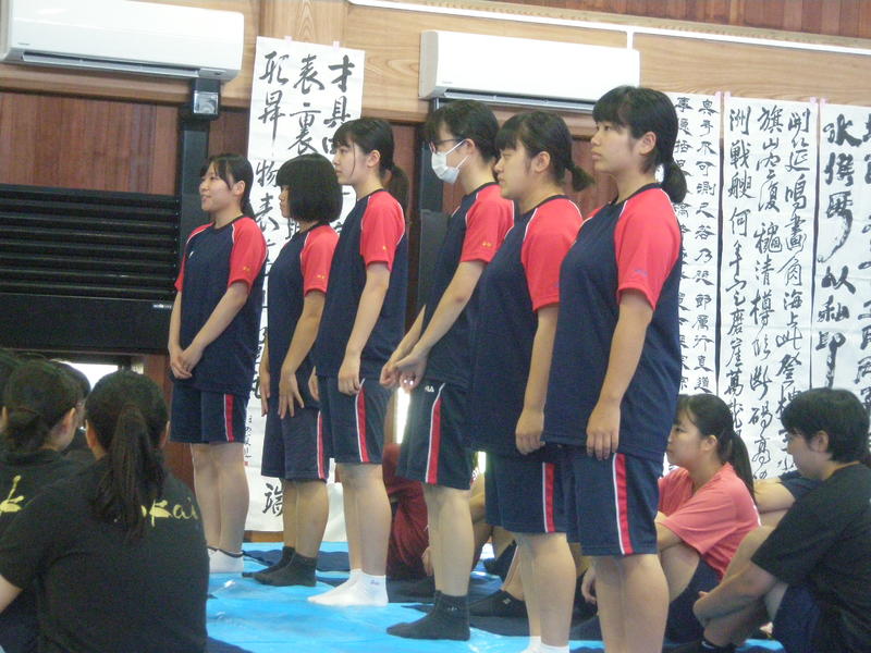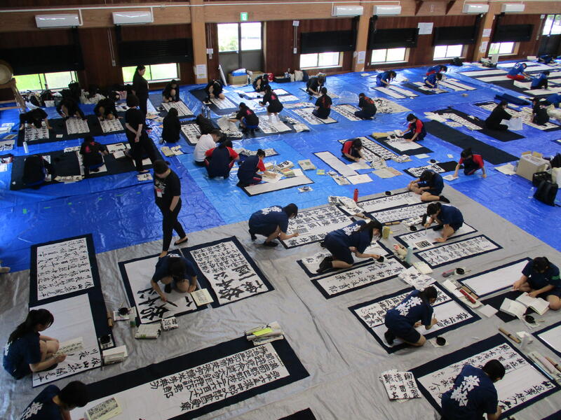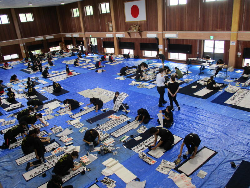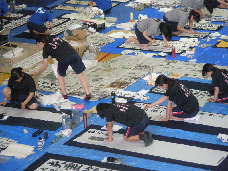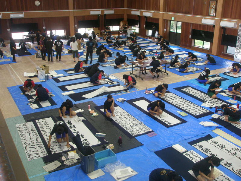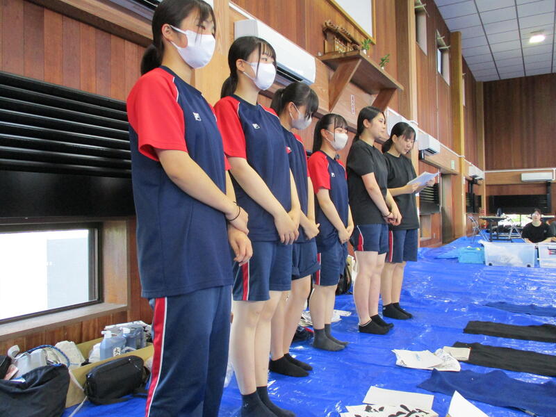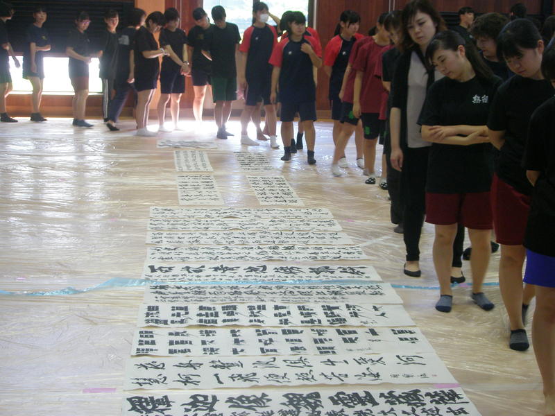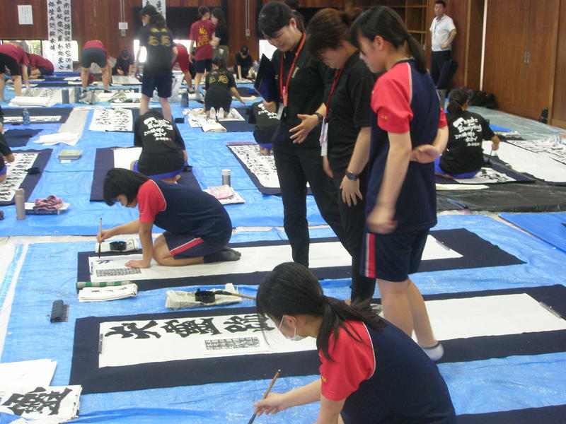 8月7日(水)に宇土市武道場で開催された熊本県高等学校書道「作品制作講習会」に南稜高校書道部員6名が参加しました。この日は県下高校の書道部員99名が揃い、武道場の中は書技の向上に取組もうとする熱気に包まれていました。