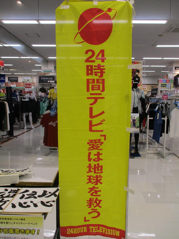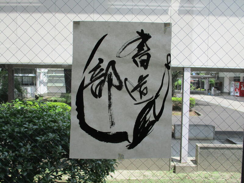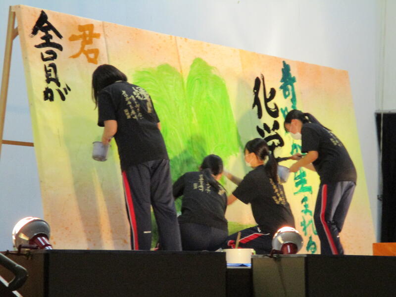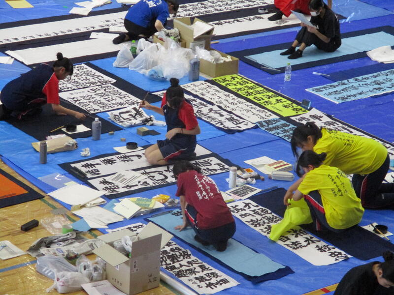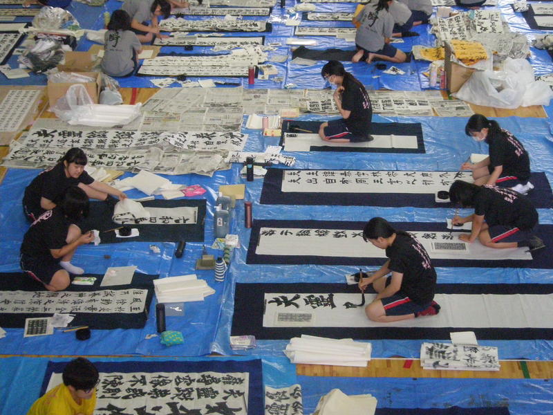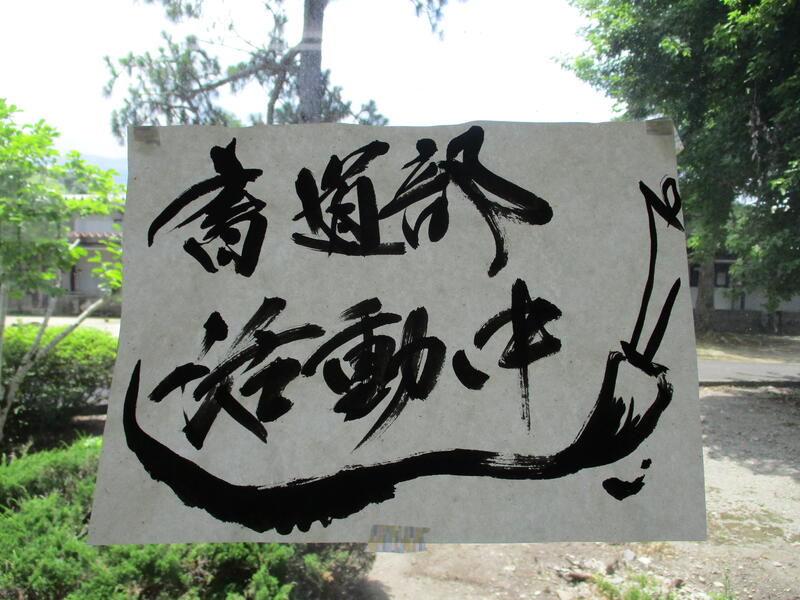 この「書道部募集中」の文字は、全校生徒へアピールできる機会が少ない中で、書道部員一同「是非書道部へ入部してください!」という気持ちを込めて書きました。しかし、当日はあいにく午後から雨の予報が出ており短縮プログラムで進行されました。残念ながら来校された皆様にグラウンドで御披露目できる機会がなく大変残念でした。