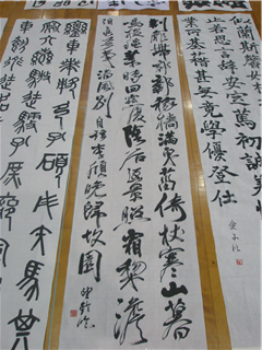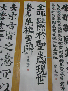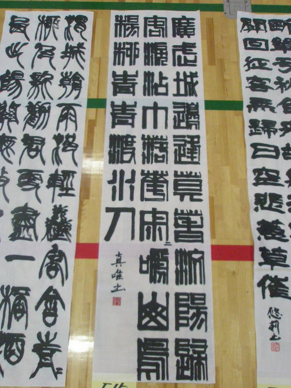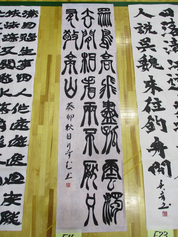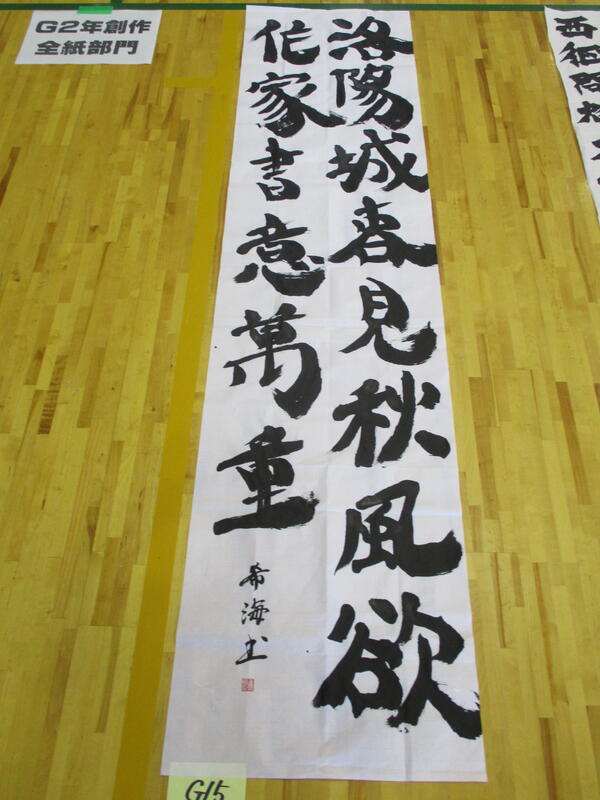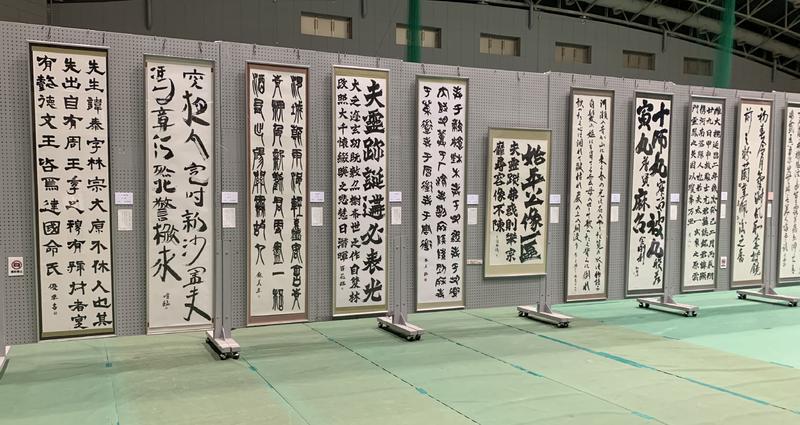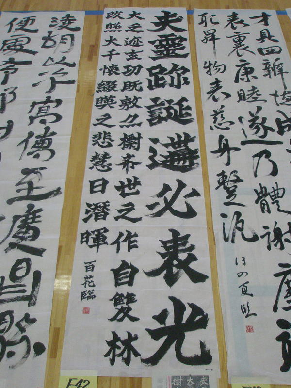 揮毫終了後、各学年・部門ごとにフロアに並べられ、参加者全員でそれぞれの作品を鑑賞しました。この中で本校書道部も全員力のこもった作品を作り上げることができました。日頃の練習の成果をこの2時間に込めた作品の数々が出そろいました。