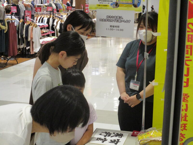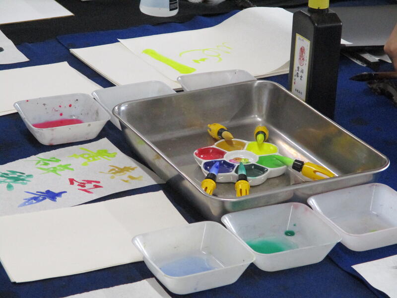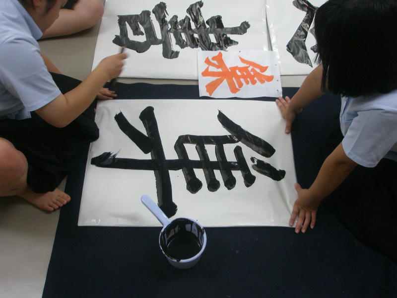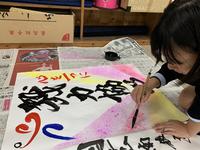 作品完成後は、普段書道で使う筆よりもさらに大きい筆を使って、大きい紙に自由にのびのびと好きな文字を書いてもらいました。