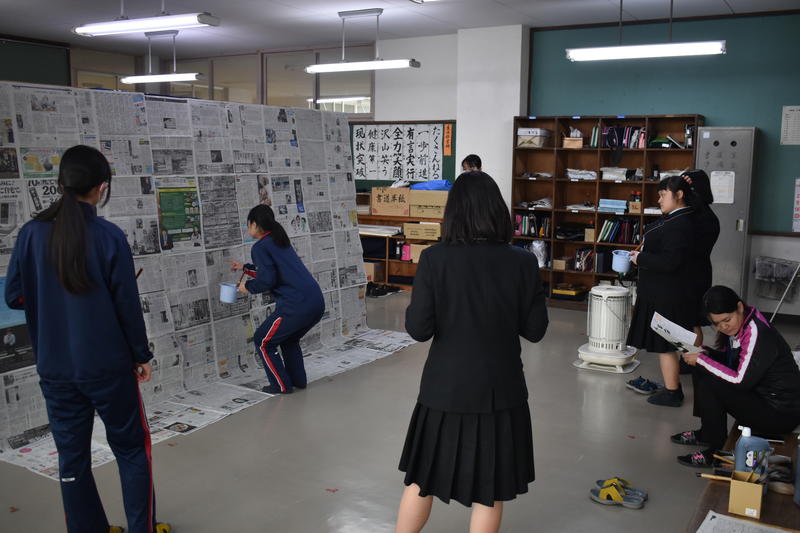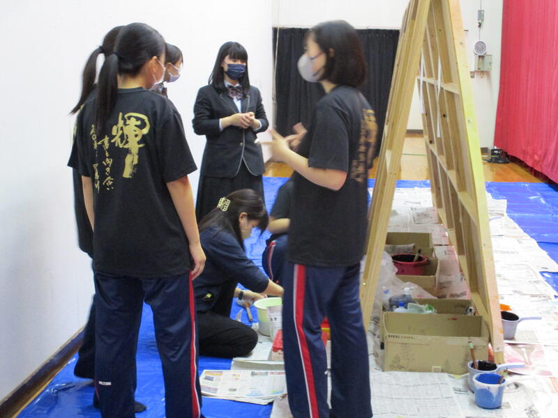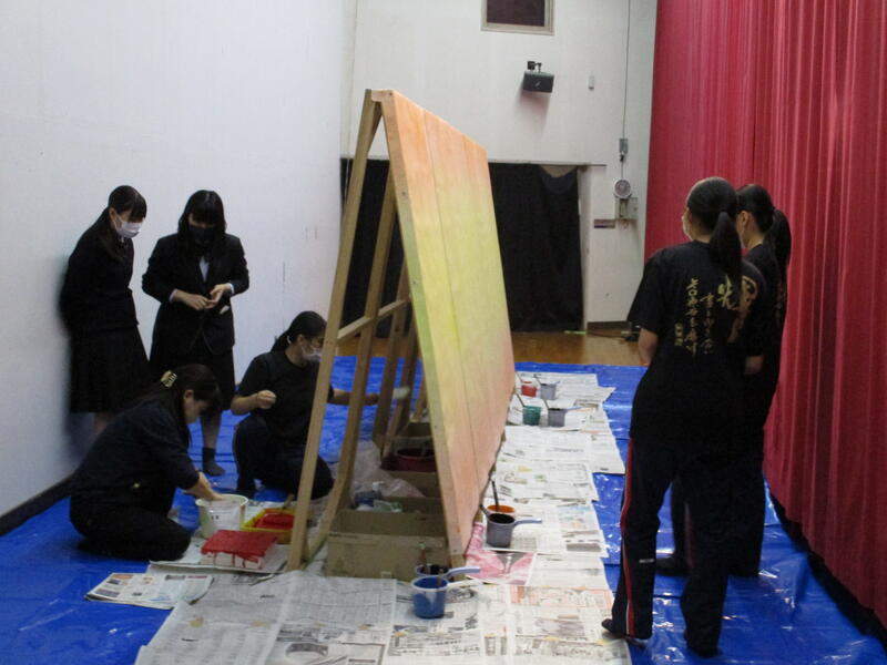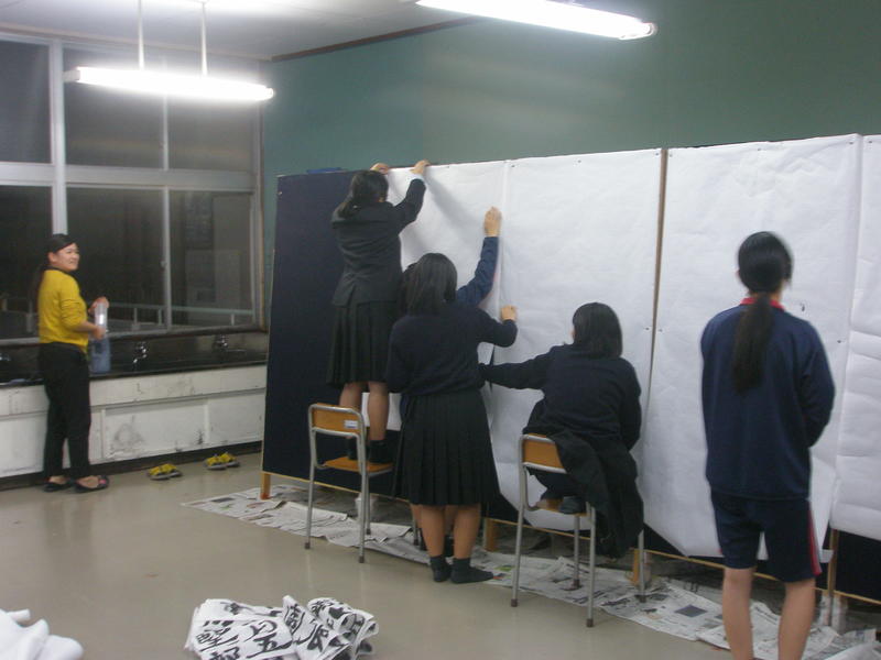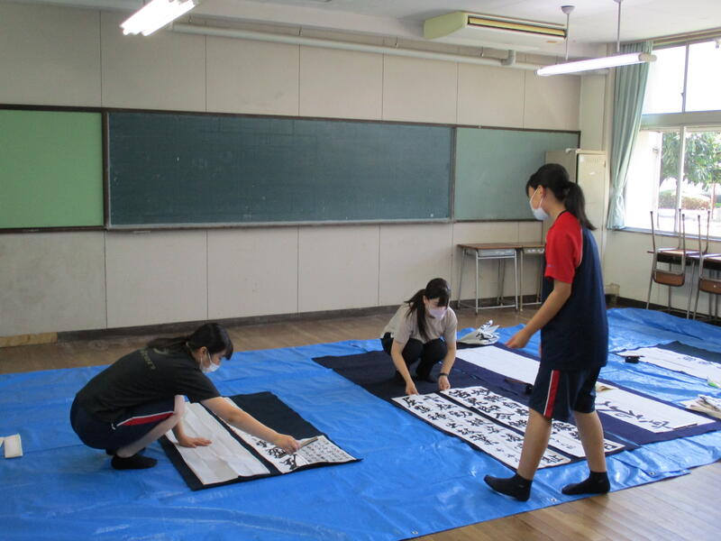 来たる9日(土)の南稜祭1日目ステージ発表に向けての練習が大詰めです。本年度は書道部のみでの書吟を披露します。今年は使用するパネルの数も昨年よりも数が増えたうえに大きくなり、作品の幅も更に大きくなりました。1・2年生部員6名を中心に、本番に向けて顧問の土肥先生に熱心に指導を仰いでいる姿が印象的でした。