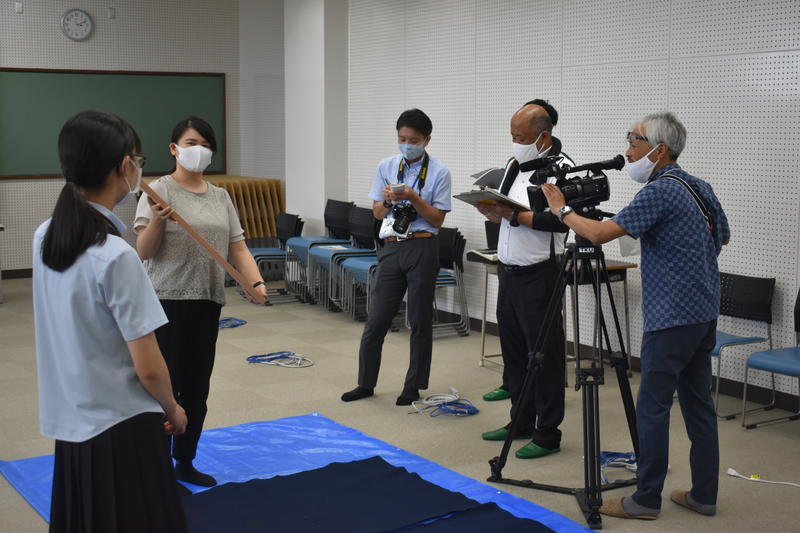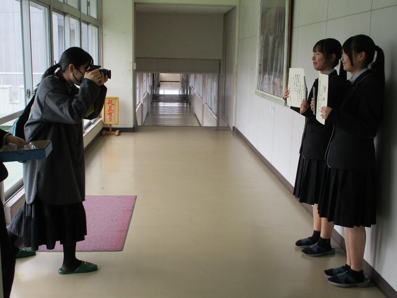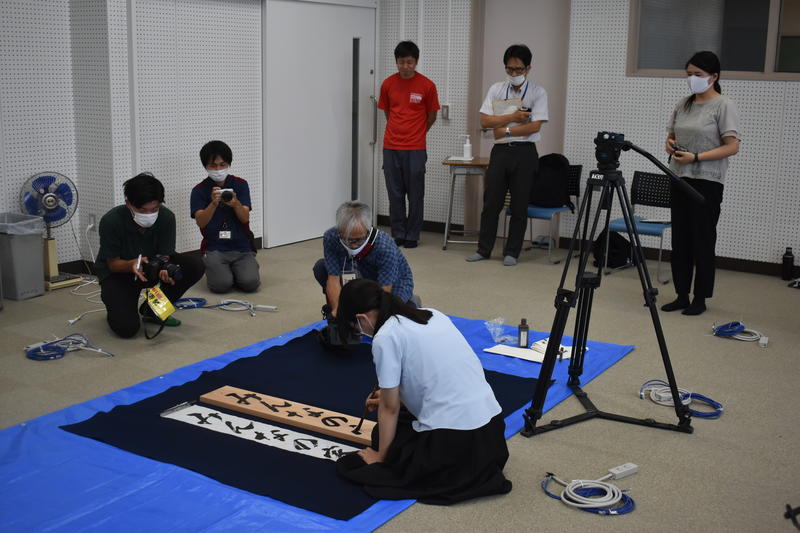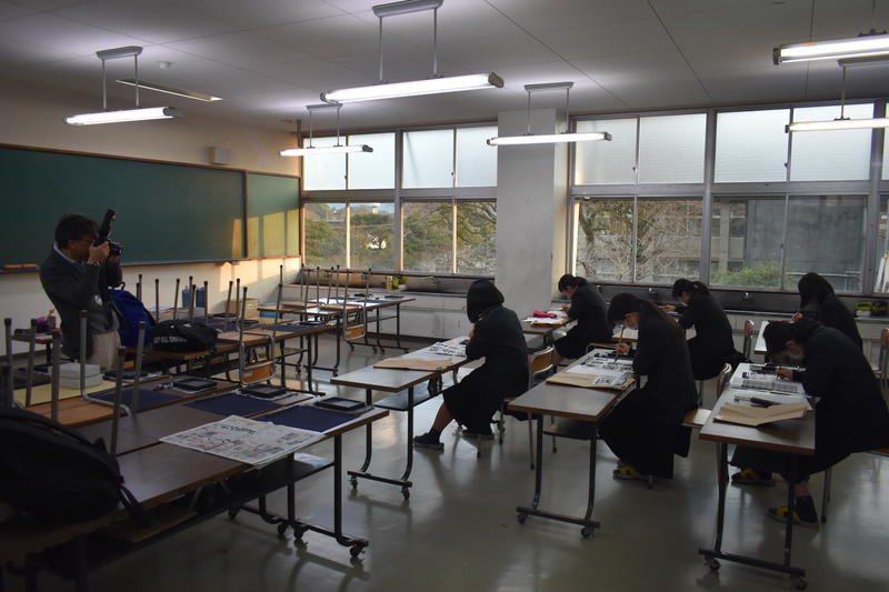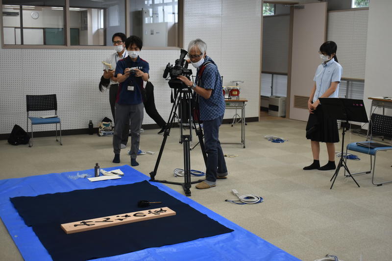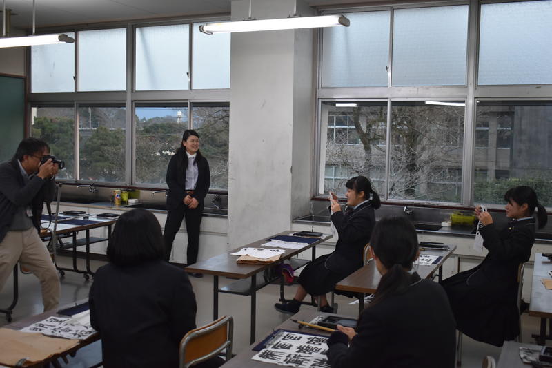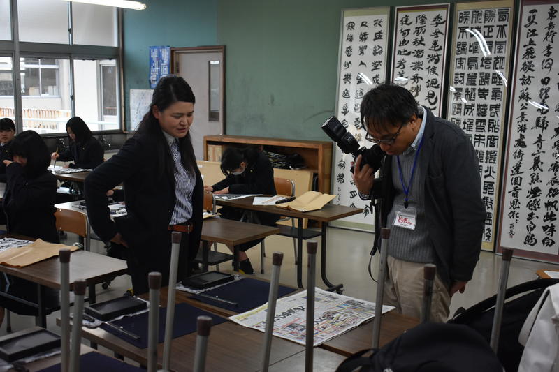 編集部の方による集合写真の撮影後、書道部顧問の土肥先生や部長を務めている石原さんへのインタビューがありました。