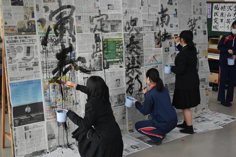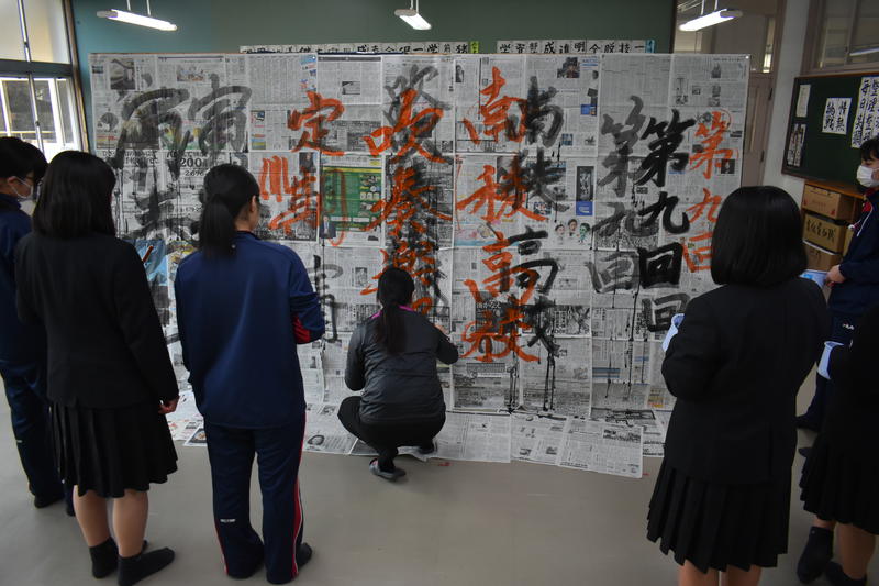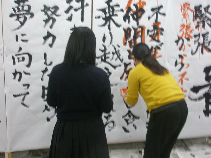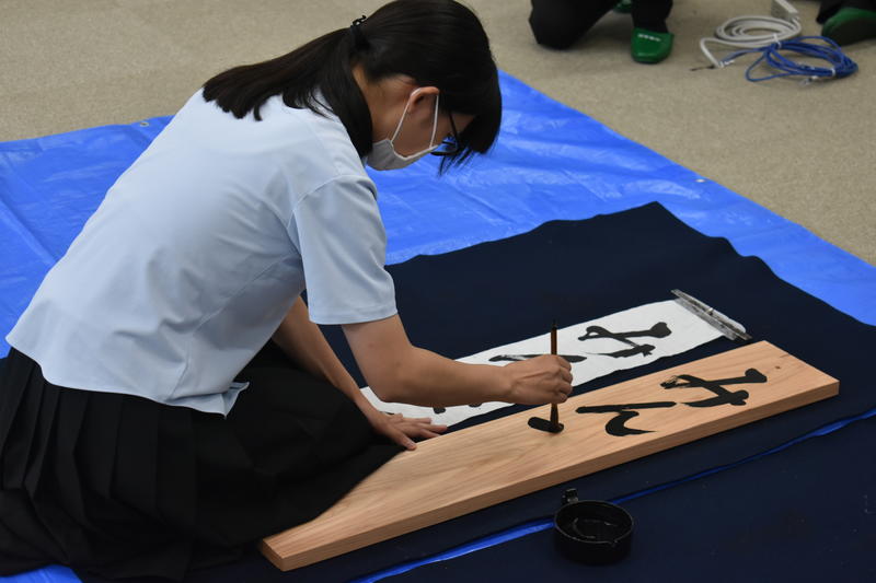 書道部員も代わるがわる曲に合わせてサビの部分の歌詞をボードに貼り付けられた用紙に揮毫していき、