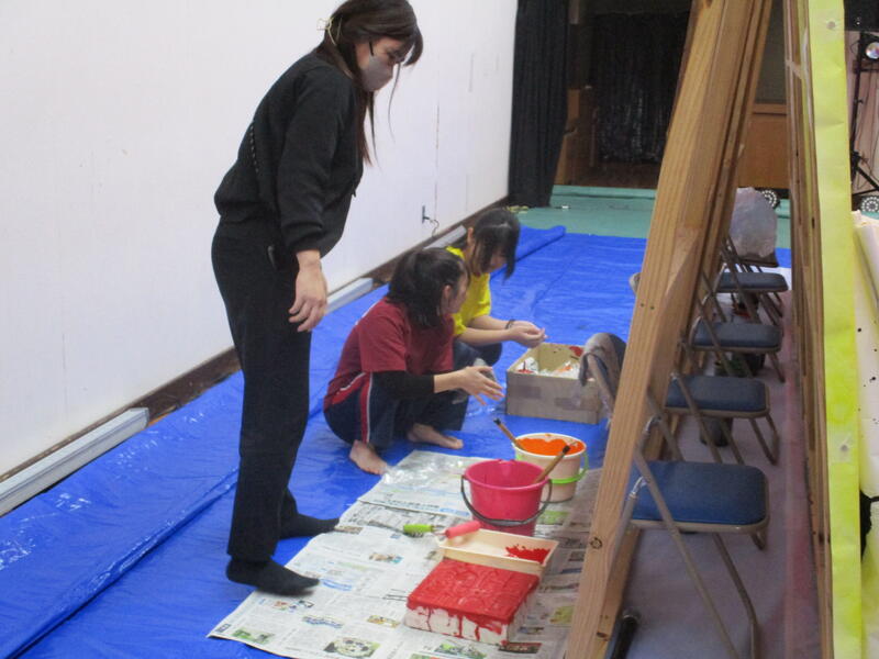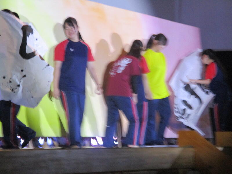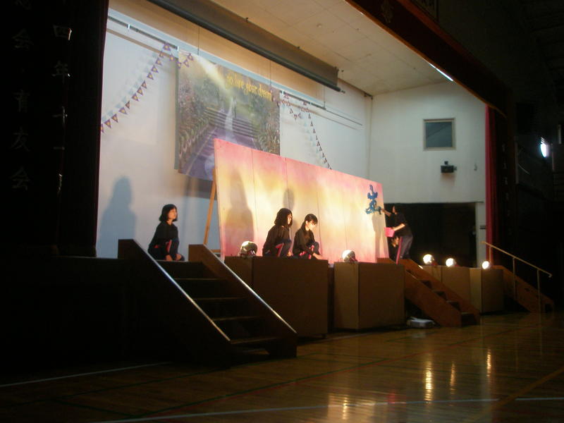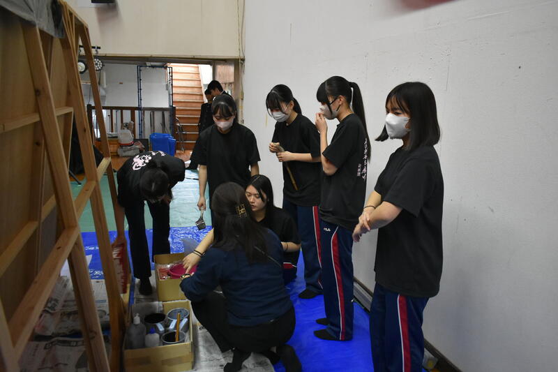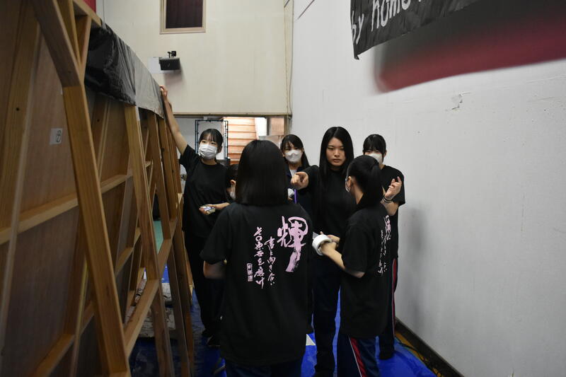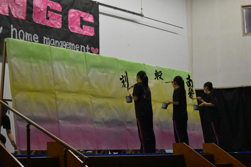 9日(土)南稜祭(1日目)でのステージ発表本番に臨みました。前日も夜暗くなるまで練習や準備に大忙しのなか、今日の出番を控えた書道部は幕の閉じられたステージ内で出番直前まで準備に余念がなく、緊張の色を隠せませんでした。